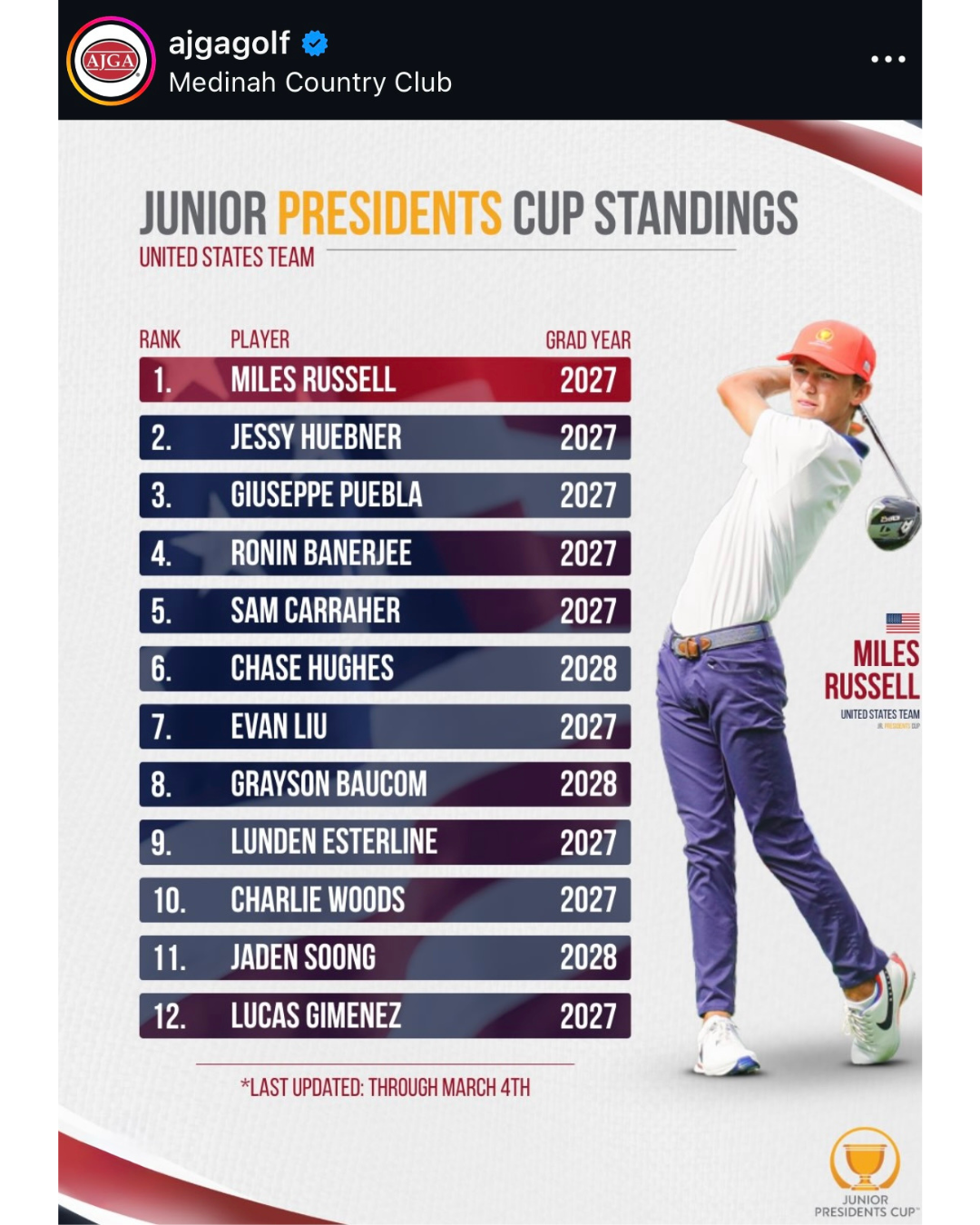 The world of junior golf is abuzz with the announcement of the 2026 Junior Presidents Cup Team Standings. This significant development puts top junior golfers a step closer to competing at the prestigious Medinah Country Club, furthering their journey in the globally renowned sport.
